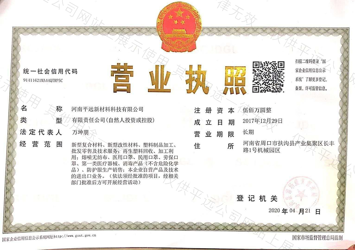 河南平遠(yuǎn)新材料科技有限公司生產(chǎn)基地坐落于河南省鄢陵縣先進(jìn)制造業(yè)開發(fā)區(qū),工廠占地10000平方米。公司通過GRS全球回收標(biāo)準(zhǔn)認(rèn)證、ISO9001質(zhì)量體系、14001環(huán)境體系和45001職業(yè)健康安全管理體認(rèn)證。華東分公司位于浙江省余姚市中國塑料城。